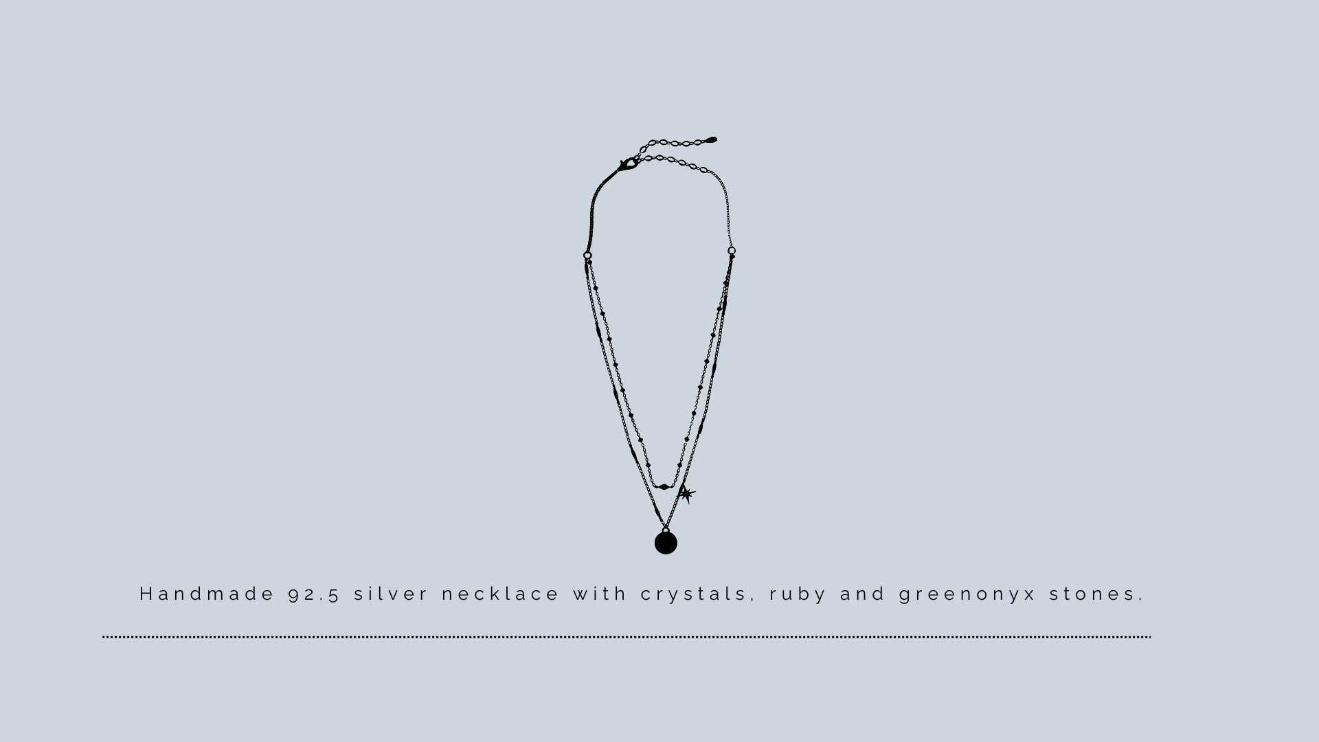 Handmade 92.5 silver necklace with crystals, ruby and greenonyx stones.